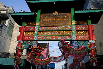 The Chinese are one of the most significant people of foreign origin in Indonesia. Some of the notable ethnic groups of Chinese in Indonesia are including the Hokkien (also commonly known in Indonesia as Hokian), Hakka (also commonly known in Indonesia as Khek or Khek-ngin), Teochew (also commonly known in Indonesia as Tiociu), Cantonese (also commonly known in Indonesia as Kanton), Fuzhou (also commonly known in Indonesia as Hokciu), etc.[13] These community are mostly concentrated in locations natively known as ꦏꦩ꧀ꦥꦸꦁꦕꦶꦤ (Kampung Cina, lit. [the] settlement of Chinese) or ꦥꦼꦕꦶꦤꦤ꧀ (Pecinan, lit. chinatowns (in Javanese)) in urban coastal regions of Java Island (mainly in northern Jakarta), Kalimantan Island (mainly in Pontianak), Sumatra Island (mainly in Medan, Riau, Palembang, and Jambi), Riau Islands, Bangka Island (mainly in northern Bangka), etc.[13]