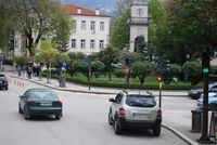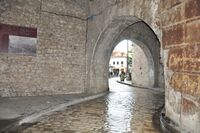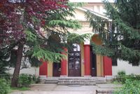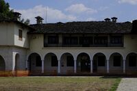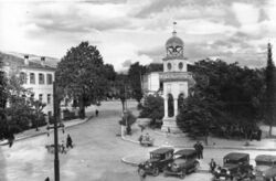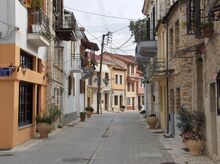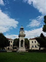 Several religious and secular monuments survive from the Ottoman period. In addition to the two mosques surviving within the walls of the castle, two further mosques are preserved outside the walls. The Mosque and Madrassa of Veli Pasha are in the centre of the city,[85] and Kaloutsiani Mosque can be found in the area of the city with the same name.[86] The now derelict "House of the Archbishop", near the football stadium, is the only old mansion that survived the fire of 1820.[87] Some of the notable landmarks in the city centre also date from the late Ottoman period. The municipal clock tower of Ioannina, designed by local architect Periklis Meliritos, was erected in 1905 to celebrate the Jubilee of sultan Abdul Hamid II. The adjacent building houses the VIII Division headquarters. It dates from the late 19th century.[88][89] Some neoclassical buildings such the post office, the old Zosimaia School, the Papazogleios Weaving School, and the former Commercial School date from the late Ottoman period as do a few arcades in the old commercial centre of the city like Stoa Louli and Stoa Liampei.[90] The churches of the Assumption of the Virgin at Perivleptos, Saint Nicholas of Kopanon and Saint Marina were rebuilt in the 1850s by funds from Nikolaos Zosimas and his brothers on the foundations of previous churches that perished in the great fire of 1820. The Cathedral of St Athanasius was completed in 1933. It was built on the foundations of the previous Orthodox cathedral which was destroyed in the fires of 1820. It is a three-aisled basilica.