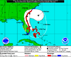 An important decision in individual preparedness is determining if and when to evacuate an area that will be affected by a tropical cyclone.[16] Tropical cyclone tracking charts allow people to track ongoing systems to form their own opinions regarding where the storms are going and whether or not they need to prepare for the system being tracked, including possible evacuation. This continues to be encouraged by the National Oceanic and Atmospheric Administration and National Hurricane Center.[17] Some agencies provide track storms in their immediate vicinity,[18] while others cover entire ocean basins. One can choose to track one storm per map, use the map until the table is filled, or use one map per season. Some tracking charts have important contact information in case of an emergency or to locate nearby hurricane shelters.[19] Tracking charts allow tropical cyclones to be better understood by the end user.[20] If evacuation is not possible or necessary, other preparedness actions include storing supplies, securing a home against extreme winds and rain, and making plans with others prior to the storm's landfall.