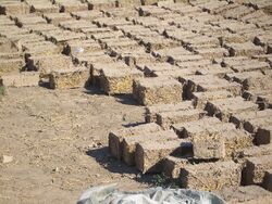 Mudbricks or Adobe bricks are preformed modular masonry units of sun-dried mud that were invented at different times in different parts of the world as civilization developed.[30] Construction with bricks avoids the delays while each course of puddled mud dries. Wall murals show that adobe production techniques were highly advanced in Egypt by 2500 BC.[11] Adobe construction is common throughout much of Africa today.[31] Adobe bricks are traditionally made from sand and clay mixed with water to a plastic consistency, with straw or grass as a binder.[32][lower-alpha 4] The mud is prepared, placed in wooden forms, tamped and leveled, and then turned out of the mold to dry for several days. The bricks are then stood on end to air-cure for a month or more.[32]