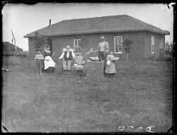 European pioneer farmers in the prairies of North America, where there is no wood for construction, often made their first home in a dug-out cave in the side of a hill or ravine, with a covering over the entrance. When they had time, they would build a sod house. The farmer would use a plow to cut the sod into bricks 1 by 2 feet (0.30 by 0.61 m), which were then piled up to form the walls.[59] The sod strips were piled grass-side down, staggered in the same way as brickwork, in three side-by-side rows, resulting in a wall over 3 feet (0.91 m) thick. The sod wall was built around door and window frames, and the corners of the wall were secured by rods driven vertically through them. The roof was made with poles or brush, covered with prairie grass, and then sealed with a layer of sod.[60] Sod houses were strong and often lasted many years, but they were damp and dirty unless the interior walls were plastered.[59] The roofs tended to leak, and sometimes collapsed in a rainstorm.[60]
