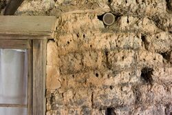 Cob, sometimes referred to as "monolithic adobe",[12] is a natural building material made from soil that includes clay, sand or small stones and an organic material such as straw. Cob walls are usually built up in courses, have no mortar joints and need 30% or more clay in the soil. Cob can be used as in-fill in post-and-beam buildings, but is often used for load bearing walls, and can bear up to two stories. A cob wall should be at least 16 inches (410 mm) thick, and the ratio of width to height should be no more than one to ten.[12] It will typically be plastered inside and out with a mix of lime, soil and sand. Cob is fireproof, and its thermal mass helps stabilize indoor temperatures.[12] Tests have shown that cob has some resistance to seismic activity. However, building codes in the developed world may not recognize cob as an approved material.[13]