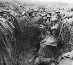 In the American Civil War (1861−1865) trenches were used for defensive positions throughout the struggle, but played an increasingly important role in the campaigns of the last two years.[89] Military earthworks perhaps culminated in the vast network of trenches built during World War I (1914−1918) that stretched from Switzerland to the North Sea by the end of 1914.[90] The two lines of trenches faced each other, manned by soldiers living in appalling conditions of cold, damp and filth.[91] Conditions were worst in the Allied trenches. The Germans were more willing to accept the trenches as long-term positions, and used concrete blocks to build secure shelters deep underground, often with electrical lighting and heating.[92]