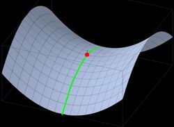 A 'saddle point' in mathematics derives its name from the fact that the prototypical example in two dimensions is a surface that curves up in one direction, and curves down in a different direction, resembling a riding saddle or a mountain pass between two peaks forming a landform saddle.