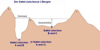 Cross-section diagram of three hills, with two saddles marked by X. • There are three peaks (Schartenhöhe) or prominences shown labeled 'A', 'B', & 'C'. • The diagram illustrates the topographic isolation (German: Dominanz)-the distance from a prominence which is also a minimum to the point of the same height. • The 'isolation' (German: Dominanz) of the right two peaks is not labeled, but is represented by the dashed line. • "sattel zwischen" means saddle between, so the labeling is saying the saddle between A and C is the same saddle as between A and B