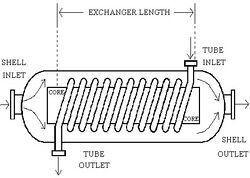 A modification to the perpendicular flow of the typical HCHE involves the replacement of shell with another coiled tube, allowing the two fluids to flow parallel to one another, and which requires the use of different design calculations.[23] These are the Spiral Heat Exchangers (SHE), which may refer to a helical (coiled) tube configuration, more generally, the term refers to a pair of flat surfaces that are coiled to form the two channels in a counter-flow arrangement. Each of the two channels has one long curved path. A pair of fluid ports are connected tangentially to the outer arms of the spiral, and axial ports are common, but optional.[24]