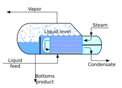 In addition to heating up or cooling down fluids in just a single phase, heat exchangers can be used either to heat a liquid to evaporate (or boil) it or used as condensers to cool a vapor and condense it to a liquid. In chemical plants and refineries, reboilers used to heat incoming feed for distillation towers are often heat exchangers.[6][7]