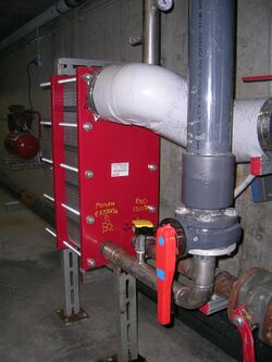 A heat exchanger is a system used to transfer heat between a source and a working fluid. Heat exchangers are used in both cooling and heating processes.[1] The fluids may be separated by a solid wall to prevent mixing or they may be in direct contact.[2] They are widely used in space heating, refrigeration, air conditioning, power stations, chemical plants, petrochemical plants, petroleum refineries, natural-gas processing, and sewage treatment. The classic example of a heat exchanger is found in an internal combustion engine in which a circulating fluid known as engine coolant flows through radiator coils and air flows past the coils, which cools the coolant and heats the incoming air. Another example is the heat sink, which is a passive heat exchanger that transfers the heat generated by an electronic or a mechanical device to a fluid medium, often air or a liquid coolant.[3]
