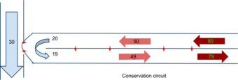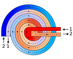 A simple heat exchange [43][44] might be thought of as two straight pipes with fluid flow, which are thermally connected. Let the pipes be of equal length L, carrying fluids with heat capacity [math]\displaystyle{ C_i }[/math] (energy per unit mass per unit change in temperature) and let the mass flow rate of the fluids through the pipes, both in the same direction, be [math]\displaystyle{ j_i }[/math] (mass per unit time), where the subscript i applies to pipe 1 or pipe 2.