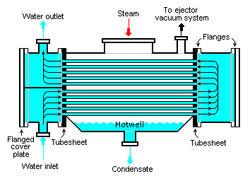 4. Condensers and Boilers Heat exchangers using a two-phase heat transfer system are condensers, boilers and evaporators. Condensers are instruments that take and cool hot gas or vapor to the point of condensation and transform the gas into a liquid form. The point at which liquid transforms to gas is called vaporization and vice versa is called condensation. Surface condenser is the most common type of condenser where it includes a water supply device. Figure 5 below displays a two-pass surface condenser.