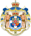 Hercules as heraldic supporters in the royal arms of Greece, in use 1863–1973. The phrase "Ηρακλείς του στέμματος" ("Defenders of the Crown") has pejorative connotations ("chief henchmen") in Greek.