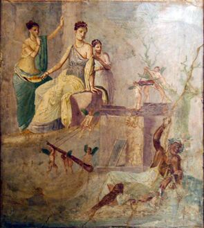 In ancient Roman society women were usually limited to two types of cults: those that addressed feminine matters such as childbirth, and cults that required virginal chastity.[14] However, there is evidence suggesting there were female worshippers of Apollo, Mars, Jupiter, and Hercules.[14] Some scholars believe that women were completely prohibited from any of Hercules's cults. Others believe it was only the "Ara Maxima" at which they were not allowed to worship.[14] Macrobius in his first book of Saturnalia paraphrases from Varro: "For when Hercules was bringing the cattle of Geryon through Italy, a woman replied to the thirsty hero that she could not give him water because it was the day of the Goddess Women and it was unlawful for a man to taste what had been prepared for her. Hercules, therefore, when he was about to offer a sacrifice forbid the presence of women and ordered Potitius and Pinarius who were in charge of his rites, not to allow any women from taking part".[14] Macrobius states that women were restricted in their participation in Hercules cults, but to what extent remains ambiguous. He mentions that women were not allowed to participate in Sacrum which is general term used to describe anything that was believed to have belonged to the gods. This could include anything from a precious item to a temple. Due to the general nature of a Sacrum, we can not judge the extent of the prohibition from Macrobius alone.[14] There are also ancient writings on this topic from Aulus Gellius when speaking on how Romans swore oaths. He mentioned that Roman women do not swear on Hercules, nor do Roman men swear on Castor.[14] He went on to say that women refrain from sacrificing to Hercules.[14] Propertius in his poem 4.9 also mentions similar information as Macrobius. This is evidence that he was also using Varro as a source.[14]