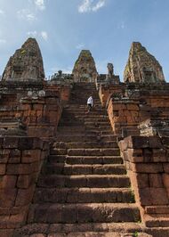 After 1000 CE Angkorian construction changed from circular or irregular earthen walls to rectangular temple enclosures of laterite, brick and stone structures.[20]:3 Geographic surveys show areas which have laterite stone alignments which may be foundations of temple sites that have not survived.[20]:4 The Khmer people constructed the Angkor monuments—which are widely distributed in Cambodia and Thailand—between the 9th and 13th centuries.[21]:209 The stone materials used were sandstone and laterite; brick had been used in monuments constructed in the 9th and 10th centuries.[21]:210 Two types of laterite can be identified; both types consist of the minerals kaolinite, quartz, hematite and goethite.[21]:211 Differences in the amounts of minor elements arsenic, antimony, vanadium and strontium were measured between the two laterites.[21]:211
