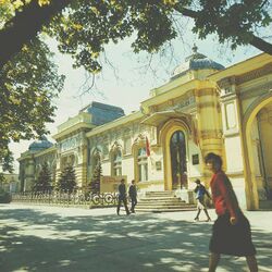 In Chișinău there are several museums. The three national museums are the National Museum of Ethnography and Natural History, the National Museum of Fine Arts, and the National Museum of History of Moldova. The National Museum of Ethnography and Natural History was founded in October 1889 by baron Alexandru Stuart, moved to its current location in 1905, and is the oldest museum in Moldova.[59] It houses more than 135,000 exhibit pieces, among them a life-sized reconstruction of the skeleton of a dinothere, discovered in the Rezine region in 1966.[60] It also includes exhibits on natural history, natural sciences, archaeology, paleontology, geology, and ethnography.[61] The building was designed by the architect Vladimir Tsyganko in a distinctive Moorish architectural style with a signature frontal façade consisting of a triangular pediment supported by two Doric columns.[62][63]