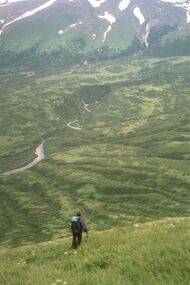 The base of the Alaska Peninsula extends outward from the end of the Alaska Range.[4]