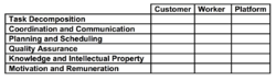 Crowdsourcing in general is a multifaceted research topic. The use of crowdsourcing in software development is associated with a number of key tension points, or facets, which should be considered (see the figure below). At the same time, research can be conducted from the perspective of the three key players in crowdsourcing: the customer, the worker, and the platform.[6]