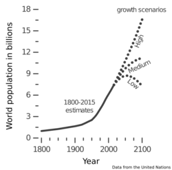 After the start of the Industrial Revolution, during the 18th century, the rate of population growth began to increase. By the end of the century, the world's population was estimated at just under 1 billion.[49] At the turn of the 20th century, the world's population was roughly 1.6 billion.[49] Dramatic growth beginning in 1950 (above 1.8% per year) coincided with greatly increased food production as a result of the industrialization of agriculture brought about by the Green Revolution.[50] The rate of human population growth peaked in 1964, at about 2.1% per year.[51] By 1940, this figure had increased to 2.3 billion.[52] Each subsequent addition of a billion humans took less and less time: 33 years to reach three billion in 1960, 14 years for four billion in 1974, 13 years for five billion in 1987, and 12 years for six billion in 1999.[53]