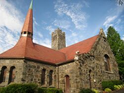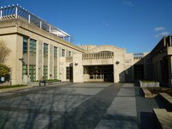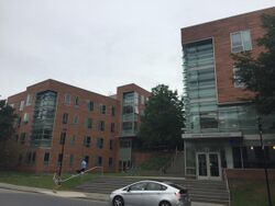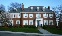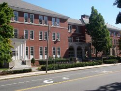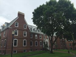 The "Uphill" portion can be accessed with the memorial stairs. Designed by the Olmsted Brothers in the 1920s, the memorial stairs form one of the main entrances to the university and allows direct access to the engineering school from the academic quad. The engineering school is part of the Tufts's "Downhill" portion of campus. Notable buildings around the engineering school include Bromfield-Pearson Hall (1893), Robinson Hall (1899), and Curtis Hall (1894). Boston architect George Albert Clough is responsible for the design of Curtis Hall and Goddard Hall. Additionally, Arland Dirlam is responsible for the designs of many buildings downhill. These include Cohen Auditorium (1950), Hodgdon Hall (1954), and Jackson Gymnasium (1947).[58] Other notable buildings downhill include the Mayer Campus Center and the Dewick Macphie Dining Hall.[59] Administrative offices also occupy the surrounding neighborhoods and nearby Davis Square, where Tufts makes payments in lieu of taxes on some of its tax-exempt (educational) properties.[60]