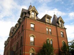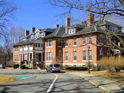 Having been one of the biggest influences in the establishment of the college, Hosea Ballou II became the first president in 1853, and College Hall, the first building on campus, was completed the following year. That building now bears Ballou's name.[22] The campus opened in August 1854. President Ballou died in 1861 and was succeeded by Alonzo Ames Miner. Though not a college graduate, his presidency was marked by several advances. These include the establishment of preparatory schools for Tufts which include Goddard Seminary, Westbrook Seminary, and Dean Academy. During the Civil War the college actively supported the Union cause. The mansion of Major George L. Stearns which stood on part of the campus was a station on the Underground Railroad. In addition to having the largest classes spring up, 63 graduates served in the Union army. The first course of a three-year program leading to a degree in civil engineering was established in 1865, the same year MIT was founded. By 1869, the Crane Theological School was organized.[23]
