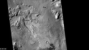 Fan, layers, and dunes on the floor of Jones Crater, as seen by CTX camera (on Mars Reconnaissance Orbiter). Note: this is an enlargement of the previous image of Jones Crater.