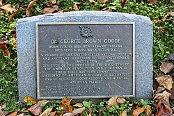 Goode was a member of the National Academy of Sciences and the American Academy of Arts and Sciences. He received from the Queen Regent of Spain the decoration of Commander in the Order of Isabella the Catholic. He also was awarded the degree of Ph.D. from Indiana University and that of LL.D. from Wesleyan University.[4] In 1893, he served as president of the Philosophical Society of Washington.[5] He died at Lanier Heights in Washington, D.C., on September 6, 1896, at the age of only 45, after a bout with pneumonia. He had been at work on a history of the Smithsonian's first fifty years, which were being celebrated in 1896. The then head of the Smithsonian, Samuel Pierpont Langley, completed the volume and wrote a memorial to Goode, published in 1901.[6] He was buried at Oak Hill Cemetery in Washington, D.C.[7]