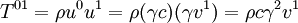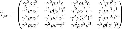 The large-scale structure of the tensor now becomes apparent. This is the stress-energy tensor of an ideal dust. The tensor is composed entirely out of the proper density and the components of 4-velocity. When velocities are low, the coefficient