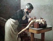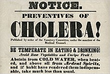 The 19th century did, however, mark a transformation period in medicine.[1] This included the first uses of chloroform and nitrous dioxides as anesthesia, important discoveries in regards of pathology and the perfection of the autopsy, and advances in our understanding of the human body.[1] Medical institutions were also transitioning to new hospital styles to try to prevent the spread of disease and stop over crowding with the mixing of the poor and the sick which had been a common practice.[1][2] With the increasing rise in urban population, disease and epidemic crisis became much more prevalent and was seen as a consequence of urban living.[1][2] Problems arose as both governments and the medical professionals at the time tried to get a handle on the spread of disease.[1] They had yet to figure out what actually causes disease.[1] So as those in authority scrambled to make leaps and bounds in science and track down what may be the cause of these epidemics, entire communities would be lost to the grips of terrible ailments.[1][2]