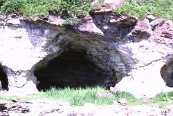 The Pleistocene glaciations almost entirely covered Scotland in ice, and Arran's highest peaks may have been nunataks at this time.[15] After the last retreat of the ice at the close of the Pleistocene epoch sea levels were up to 70 metres (230 ft) lower than at present and it is likely that circa 14,000 BP the island was connected to mainland Scotland.[23] Sea level changes and the isostatic rise of land makes charting post-glacial coastlines a complex task, but it is evident that the island is ringed by post glacial raised beaches.[24] King's Cave on the south west coast is an example of an emergent landform on such a raised beach. This cave, which is over 30.5 metres (100 ft) long and up to 15.3 metres (50 ft) high, lies well above the present day sea level.[25][26][27] There are tall sea cliffs to the north east including large rock slides under the heights of Torr Reamhar, Torr Meadhonach and at Scriden (An Scriodan) at the far north end of the island.[13][28][29]