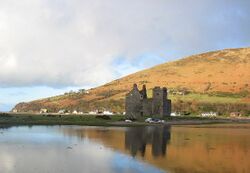On the opposite side of the island near Blackwaterfoot is the King's Cave (see above), where Robert the Bruce is said to have taken shelter in the 14th century.[45] Bruce returned to the island in 1326, having earlier granted lands to Fergus MacLouis for assistance rendered during his time of concealment there. Brodick Castle played a prominent part in the island's medieval history. Probably dating from the 13th century, it was captured by English forces during the Wars of Independence before being taken back by Scottish troops in 1307. It was badly damaged by action from English ships in 1406 and sustained an attack by John of Islay, the Lord of the Isles in 1455. Originally a seat of the Clan Stewart of Menteith it passed to the Boyd family in the 15th century.[46][47] For a short time during the reign of King James V in the 16th century, the Isle of Arran was under the regency of Robert Maxwell, 5th Lord Maxwell.[48]
