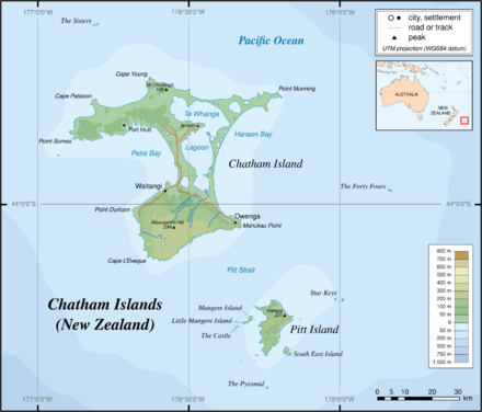 ![]() The two largest islands: Chatham (Rēkohu) and Pitt Island (Rangiaotea), to the southeast | |