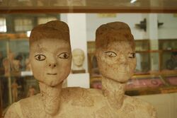 ʿAin Ghazal is well known for a set of small human statues found in 1983, when local archeologists stumbled upon the edge of a large pit containing them.[22] These statues are human figures made with white plaster, with painted eyes. Thirty-two figures were found in two caches, fifteen of them full figures, fifteen busts, and two fragmentary heads. Three of the busts depicted two-headed characters, the significance of which is not clear.[21]