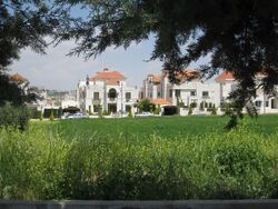 Residential buildings are limited to four stories above street level and if possible another four stories below, according to the Greater Amman Municipality regulations. The buildings are covered with thick white or beige limestone or sandstone.[116] The buildings usually have balconies on each floor, with the exception of the ground floor, which has a front and back yard. Some buildings make use of Mangalore tiles on the roofs or on the roof of covered porches. Hotels, towers and commercial buildings are either covered by stone, plastic or glass.[117]