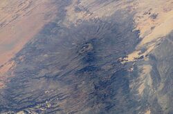 In volcanology, a pyroclastic shield or ignimbrite shield is an uncommon type of shield volcano. Unlike most shield volcanoes, pyroclastic shields are formed mostly of pyroclastic and highly explosive eruptions rather than relatively fluid basaltic lava issuing from vents or fissures on the surface of the volcano.[1] They typically display low-angle flank slopes and often have a central caldera caused by large eruptions. Lava is commonly extruded after explosive activity has ended. The paucity of associated Plinian fall deposits indicates that pyroclastic shields are characterized by low Plinian columns.