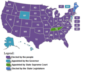 Attorneys general are chosen in four different ways; they are either popularly elected or appointed by the governor, the state legislature, or the state supreme court. The office is elective in 43 states and chosen by a state government body in seven.[1]