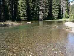 A mid-channel bar, is also often referred to as a braid bar because they are often found in braided river channels. Braided river channels are broad and shallow and found in areas where sediment is easily eroded like at a glacial outwash, or at a mountain front with high sediment loads.[1][2] These types of river systems are associated with high slope, sediment supply, stream power, shear stress, and bed load transport rates.[2] Braided rivers have complex and unpredictable channel patterns, and sediment size tends to vary among streams.[3] It is these features that are responsible for the formations of braid bars. Braided streams are often overfed with massive amounts of sediment which creates multiple stream channels within one dominant pair of flood bank plains.[2] These channels are separated by mid-channel or braid bars. Anastomosing river channels also create mid-channel bars, however they are typically vegetated bars, making them more permanent than the bars found in a braided river channel which have high rates of change because of the large amounts of non-cohesive sediment, lack of vegetation, and high stream powers found in braided river channels.[3][1]