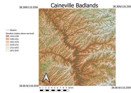 This qualitative topographic map of a section of a section of the Caineville Badlands shows the extensive drainage network in the arid environment. Relating to Montgomery and Dietrich’s definition of the elementary parts of a drainage basin,[3] the source area for each of the channels is relatively very small, resulting in a large number of channels forming. The image of the Caineville Badlands displays the lack of vegetation and numerous channels. The Caineville Badlands are located in an arid environment, receiving an average of 125mm of precipitation per year.[13] This low precipitation contrasts with Montgomery and Dietrich’s equation of drainage density, which predicts that drainage density should be low where rainfall is low.[3] This behavior is more consistent with Langbein and Schumm’s expression of erosion rate as a function of rainfall.[12] According to the equation, erosion will increase with precipitation up to a point where the precipitation can support stabilizing vegetation. The lack of vegetation present in the image of the Caineville Badlands implies that the rainfall rate of this region is below the critical rainfall amount vegetation can be supported.
