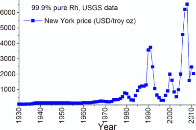 The main exporter of rhodium is South Africa (approximately 80% in 2010) followed by Russia.[33] The annual world production is 30 tonnes. The price of rhodium is highly variable. In 2007, rhodium cost approximately eight times more than gold, 450 times more than silver, and 27,250 times more than copper by weight. In 2008, the price briefly rose above $10,000 per ounce ($350,000 per kilogram). The economic slowdown of the 3rd quarter of 2008 pushed rhodium prices sharply back below $1,000 per ounce ($35,000 per kilogram); the price rebounded to $2,750 by early 2010 ($97,000 per kilogram) (more than twice the gold price), but in late 2013, the prices were less than $1,000. Political and financial problems[clarification needed] led to very low oil prices and over supply, causing most metals to drop in price. The economies of China, India and other emerging countries slowed in 2014 and 2015. In 2014 alone, 23,722,890 motor vehicles were produced in China, excluding motorbikes.[clarification needed] This resulted in a rhodium price of 740.00 US-$ per Troy ounce (31.1 grams) in late November 2015.[34]