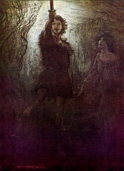 Tyrfing appears in the Hervarar Saga. Svafrlami was the King of Gardariki, and a grandson of the god Odin. He caught the dwarves, Dvalin and Durin, and forced them to forge a sword with a golden hilt that would never miss a stroke, would never rust and would cut through stone and iron as easily as through clothes. The dwarves made the sword, and it shone and gleamed like fire. However, in revenge they cursed it so that it would kill a man every time it was used and that it would be the cause of three great evils. They also cursed it so that it would kill Svafrlami himself. It would cost the life of not only Svafrlami, but also the life of the Swedish hero Hjalmar.