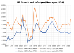 The monetarist quantity theory of money holds that changes in the price level are directly caused by changes in the money supply.[16] Whereas there is empirical evidence that there is a long-run positive correlation between the growth rate of the money stock and the rate of inflation, the quantity theory has proved unreliable in the short- and medium-run time horizon relevant to monetary policy and is abandoned as a practical guideline by most central banks today.[17]