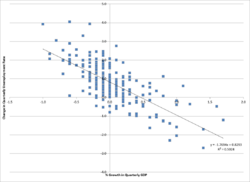 Cyclical unemployment occurs when growth stagnates. Okun's law represents the empirical relationship between unemployment and short-run GDP growth.[8] The original version of Okun's law states that a 3% increase in output would lead to a 1% decrease in unemployment.[9]