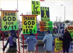 Fred Phelps and the Westboro Baptist Church were known to subscribe to a particularly whacked variant of the Hyper-Calvinist belief system.[5] Phelps not only believed that filthy reprobates are predestined for hell, but also that God actively hates them and brings about their untimely deaths. He identified as a Primitive Baptist, but other Primitive Baptists rejected any association with him.