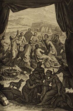 Jacob had secretly fled the house of Laban, his father-in-law, in the middle of the night, taking flocks of animals, all his other assets, and his two wives and their children (the daughters and grandchildren of Laban) with him, intending never to return. Laban discovered this and pursued Jacob. After discussion, the two decided to formalize the separation.