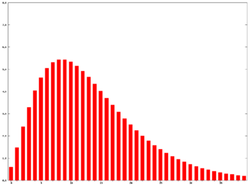 The triple-smoothed EMA is very different from a plain EMA. In a plain EMA the latest few days dominate and the EMA follows recent prices quite closely; however, applying it three times results in weightings spread much more broadly, and the weights for the latest few days are in fact smaller than those of days further past. The following graph shows the weightings for an N=10 triple EMA (most recent days at the left):