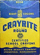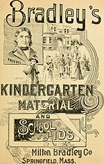 Milton Bradley was an early advocate of Friedrich Froebel's idea of Kindergarten. Springfield's first kindergarten students were Milton Bradley's two daughters, and the first teachers in Springfield were Milton, his wife and his father.[6] Milton Bradley's company's involvement with kindergartens began with the production of "gifts," the term used by Froebel for the geometric wooden play things that he felt were necessary to properly structure children's creative development. Bradley spent months devising the exact shades in which to produce these materials; his final choice of six pigments of red, orange, yellow, green, blue, and violet would remain the standard colors for children's art supplies through the 20th century.[5]