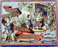 By the 1870s, the company was producing dozens of games and capitalizing on fads. Milton Bradley became the first manufacturer in America to make croquet sets. The sets included wickets, mallets, balls, stakes, and an authoritative set of rules to play by that Bradley himself had created from oral tradition and his own sense of fair play.[2] In 1880, the company began making jigsaw puzzles.