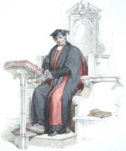 Aquatint of a Doctor of Divinity at the University of Oxford, in the scarlet and black academic robes corresponding to his position. (The Doctor appears here in his Convocation habit, rather than his full ceremonial dress.) From Rudolph Ackermann's