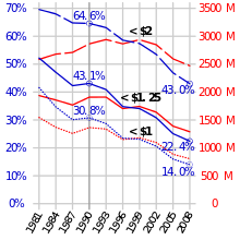 Between 1990 and 2010 the population living on less than $1.25 a day in developing countries halved to 21%, or 1.2 billion people, achieving MDG1A before the target date, although the biggest decline was in China, which took no notice of the goal. However, the child mortality and maternal mortality are down by less than half. Sanitation and education targets will also be missed.[52]