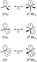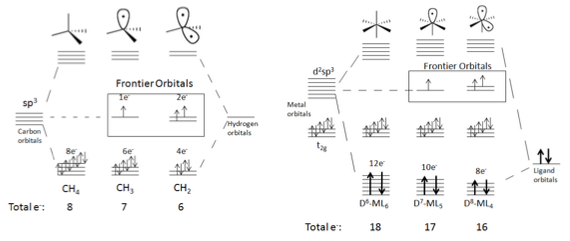 As seen above, when a fragment is formed from CH4, one of the sp3 hybrid orbitals involved in bonding becomes a nonbonding singly occupied frontier orbital. The frontier orbital’s increased energy level is also shown in the figure. Similarly when starting with a metal complex such as d6-ML6, the d2sp3 hybrid orbitals are affected. Furthermore, the t2g nonbonding metal orbitals are unaltered.