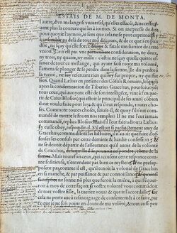 Les Essais (Bordeaux copy) is a 1588 edition of Michel de Montaigne's Essais held by the Bibliothèque municipale de Bordeaux.[1] The book contains about 1300 manuscript corrections and annotations made by Montaigne between the summer of 1588 and the 13 September 1592 (date of his death). This unique document sheds light on the way Montaigne worked[2] and on the genesis of the final edition of Les Essais.