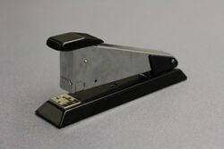 A stapler is a mechanical device that joins pages of paper or similar material by driving a thin metal staple through the sheets and folding the ends. Staplers are widely used in government, business, offices, work places, homes and schools.[1]